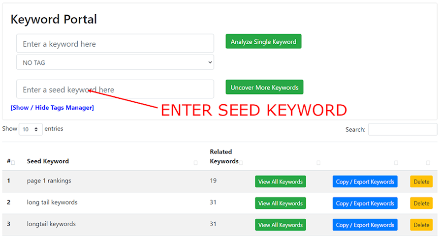 Step #1: Enter a seed keyword and Keyword Phoenix will uncover related keywords from ‘Google Suggest’ that people actually search for.