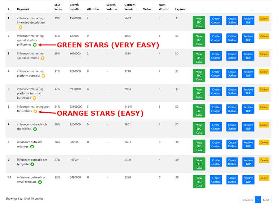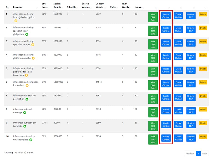 Step #4: Click on the ‘Create Content’ button next to each of these easy keywords. (You can choose whether to create plain content or add full HTML markup in your settings. I personally choose the HTML option so that the content is ‘SEO’ optimised for me).