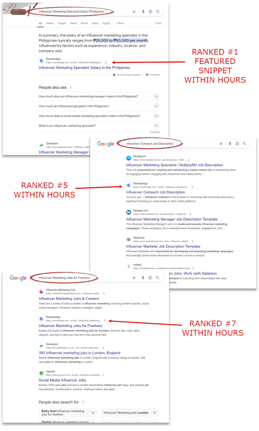 After submitting your published page URLs to Google Search Console (to get them indexed on Google quickly), they will usually appear in the search results and rank on the 1st page within a few hours.