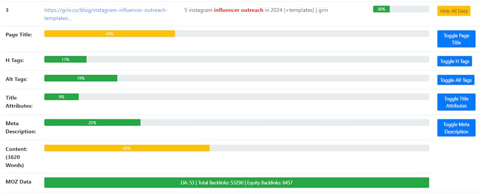 It will also tell you how well each on-page element such as the H Tags, Alt Tags, Meta Tags and the main content itself is optimized for the target keyword.