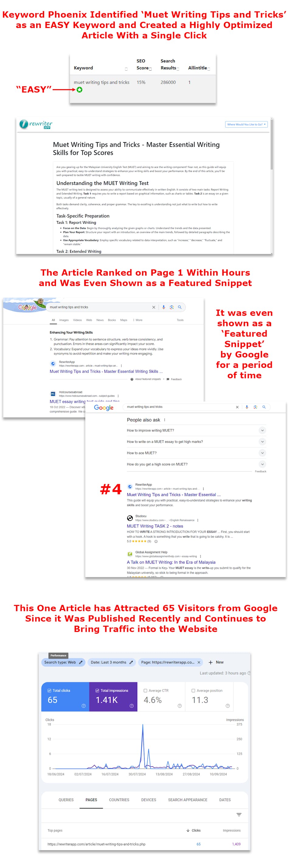 Not only will Keyword Phoenix identify ‘easily’, rank-able keywords. It will now also create HIGHLY ‘SEO’ OPTIMISED articles for you to publish online that will rank on Google’s first page.