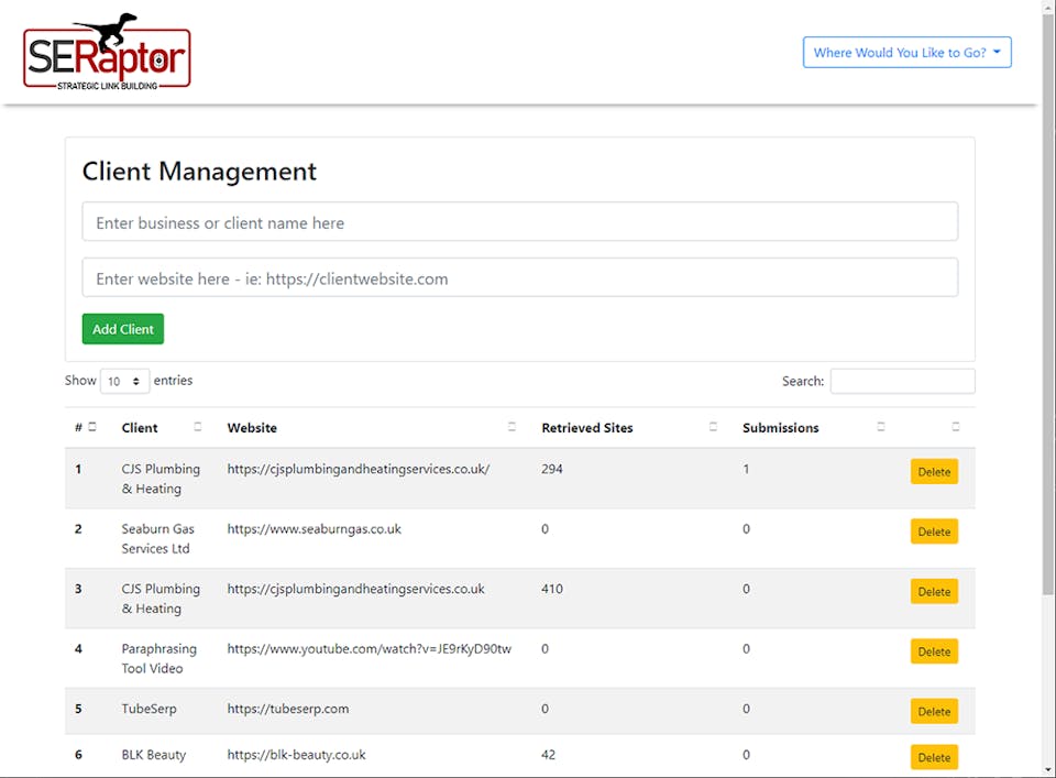 Want to build backlinks and citations for multiple clients or websites? No problem! SERaptor has a built-in ‘Client Management’ system that allows you to tag any SEO campaign or backlink log to any specific ‘client’.